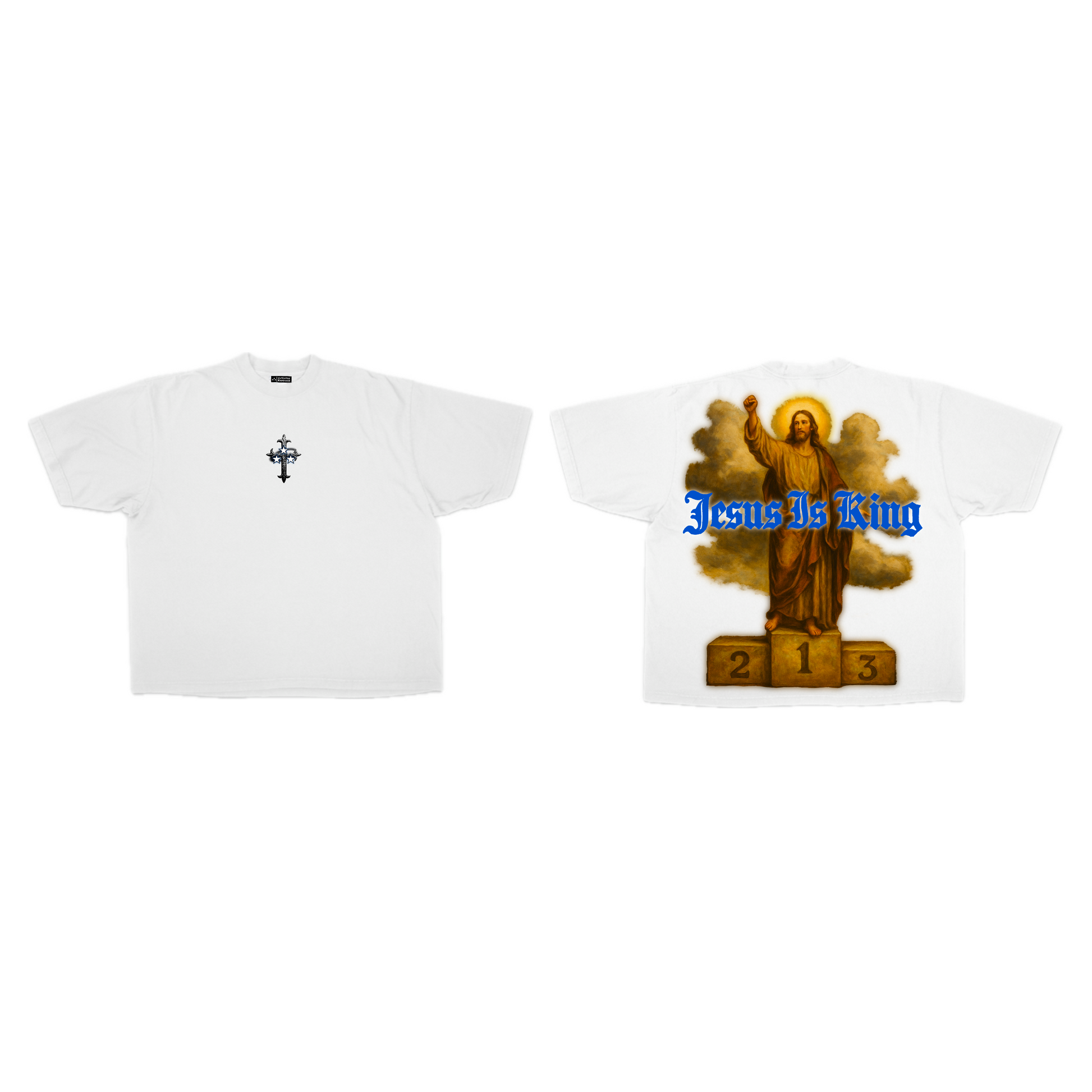 Bold in message and timeless in truth, the Jesus Is King tee reminds us who truly reigns above all. Featuring Jesus standing atop a 1st-place podium with clouds parting behind Him, this design places Christ as the undisputed King, above every title, every name, and every worldly throne.